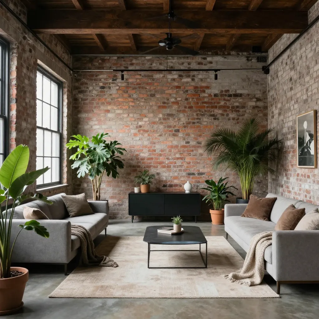 A spacious urban loft featuring minimalist design was enhanced with large statement plants that add warmth and natural texture to the industrial aesthetic.