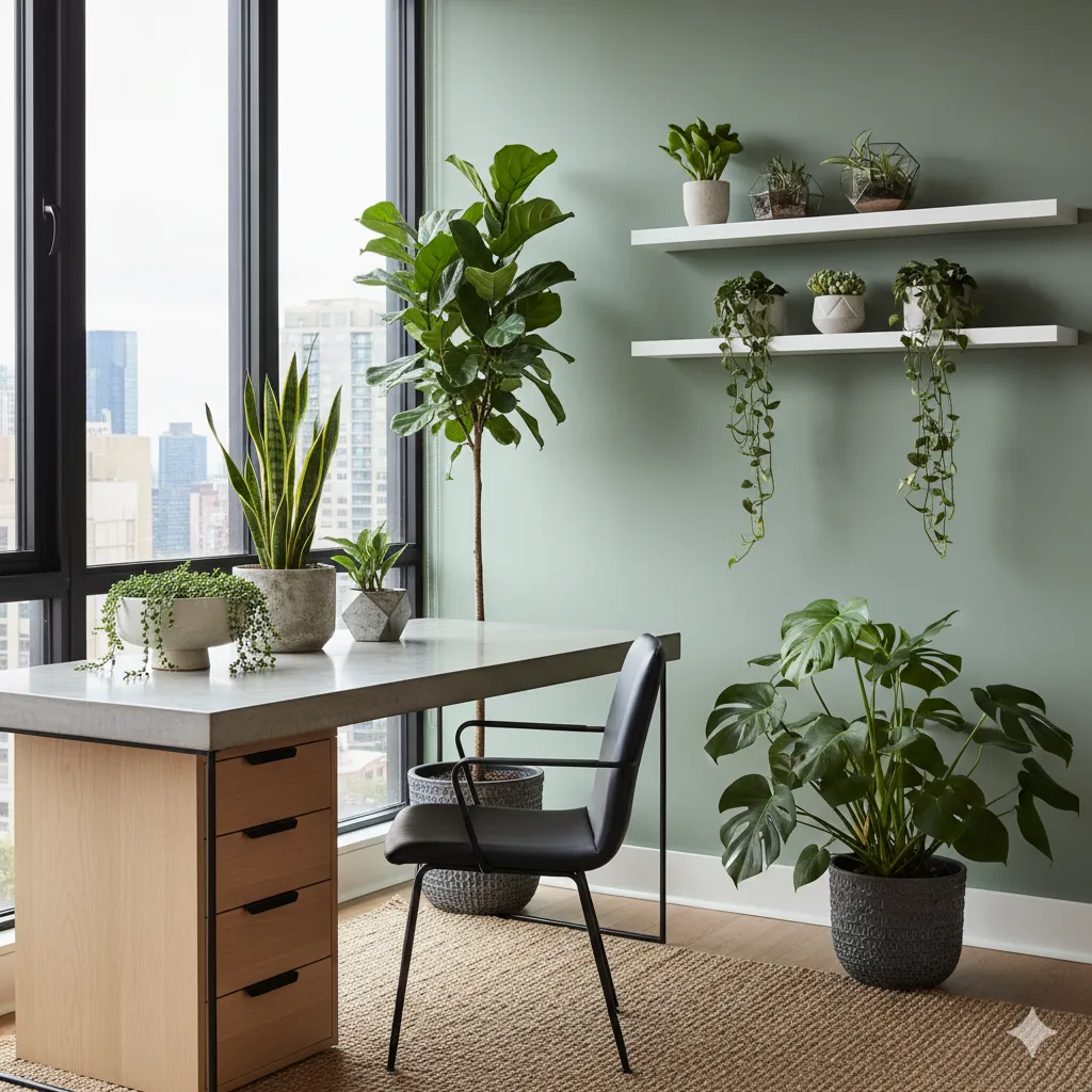 A home office space was transformed into a productive and inspiring environment using air-purifying plants that improve air quality while maintaining a professional appearance.