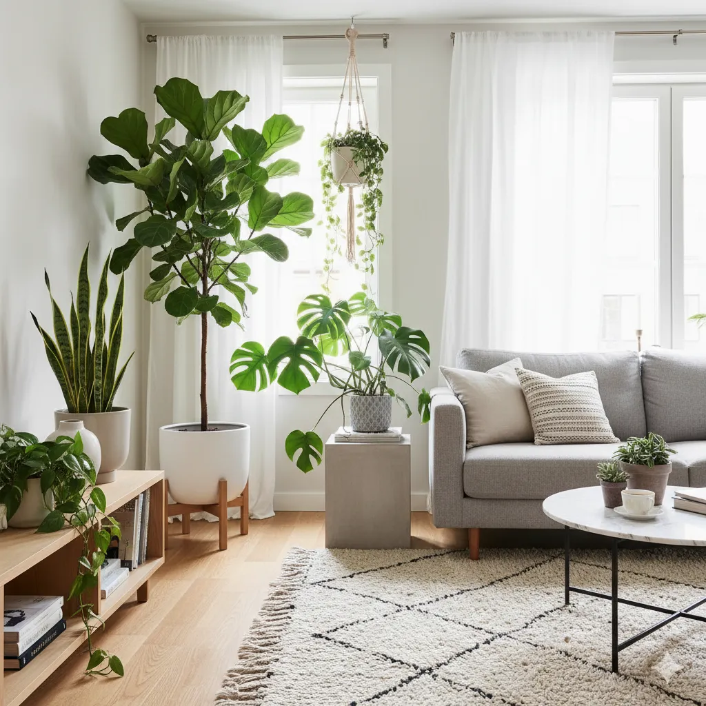 Key elements: Monstera, Fiddle Leaf Fig, Snake Plants
