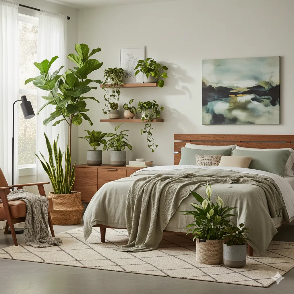 A bedroom was transformed into a peaceful sanctuary using plants known for their calming properties and ability to improve sleep quality through better air quality.